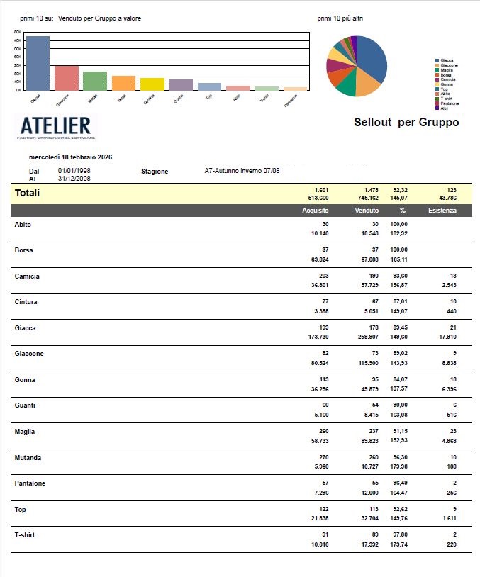 - Vendita Stock: Questa colonna è vitale per la salute finanziaria. Ti indica la capacità di trasformare la merce ferma in liquidità immediata (59 capi nel nostro esempio ), liberando spazio in magazzino per le nuove collezioni.